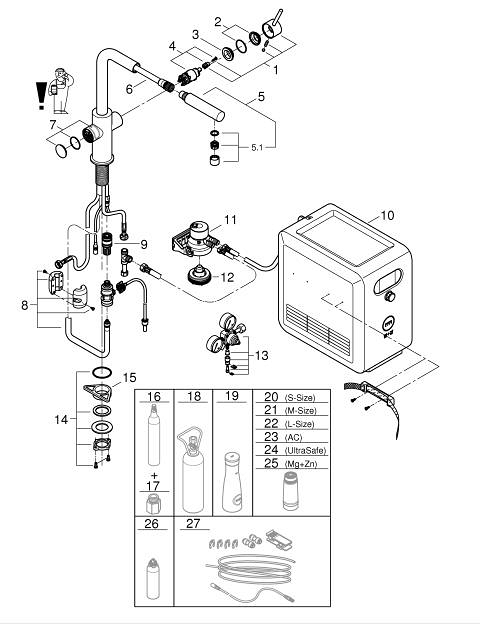 - GROHE Blue filter, CO₂ bottle and cleaning cartridge are not included in the delivery and have to be ordered separately
